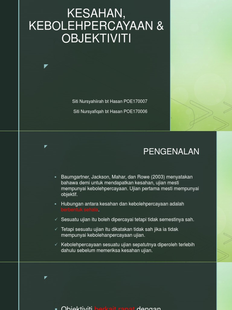 Kesahan dan kebolehpercayaan diukur dengan menggunakan perisian winstep versi 3.69.1.11. Powerpoint templates mengilham harapan, mencipta masa depaninspiring futrures, inspiring possibilitiesinstrumentasi: Dalam kajian yang menggunakan pendekatan kualitatif, data yang diperoleh perlu diyakini dan benar agar hasil dapatan kajian boleh dipercayai dan tidak kajian kualitatif mengariskan beberapa proses untuk mempastikan data yang diperoleh mempunyai kesahan dan kebolehpercayaan yang tinggi. Pengajaran, teknologi dan penaksiran 1. Kesahan dan kebolehpercayaan instrumen penghayatan akidah norsaleha mohd.